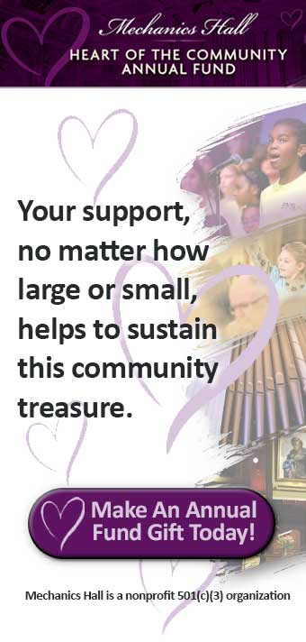 Membership Invite: Mechanics Hall Members are invited to enjoy this hour-long program. schoolchildren will be seated on the floor, and we will have reserved balcony seating for our members. Remember there is no elevator access to the balcony. Seating accomodations can be made if needed. Members need to register by email with the Box Office at boxoffice@staging.mechanicshall.org. Donations happily accepted.